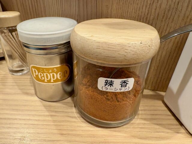 卓上調味料は胡椒と香りの強い辛味調味料の辣香が置いてありました。