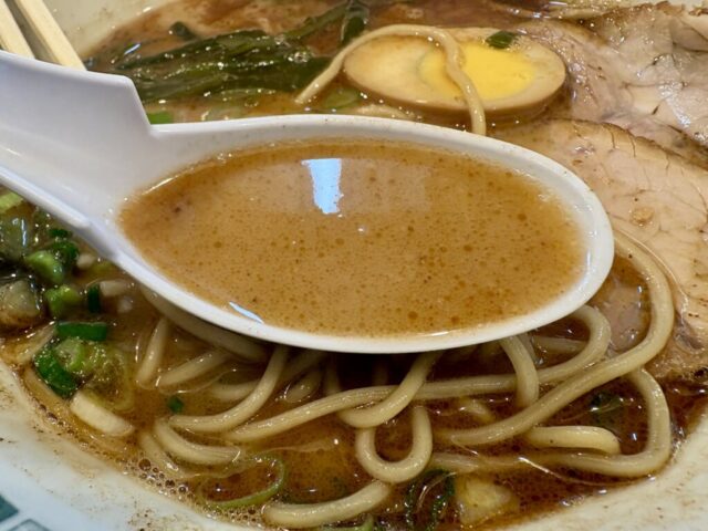 スープは塩味がほどほどに効いていて、豚骨の優しい味わいが口に広がる。