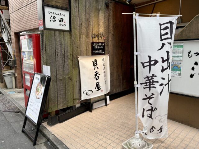 多分「【 もつ煮込み専門店 】日本酒と焼酎 沼田はなれ 新宿三丁目店」を間借りしていると思われますが、「貝出汁中華そば 貝香屋」の札がかかっていれば大丈夫です。