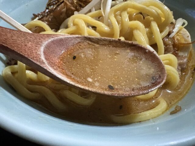 スープ・・・豚骨出汁と味噌の優しい味わいで、口当たりはさっぱりとしている。塩味はちょい強めでそこまで辛くない。